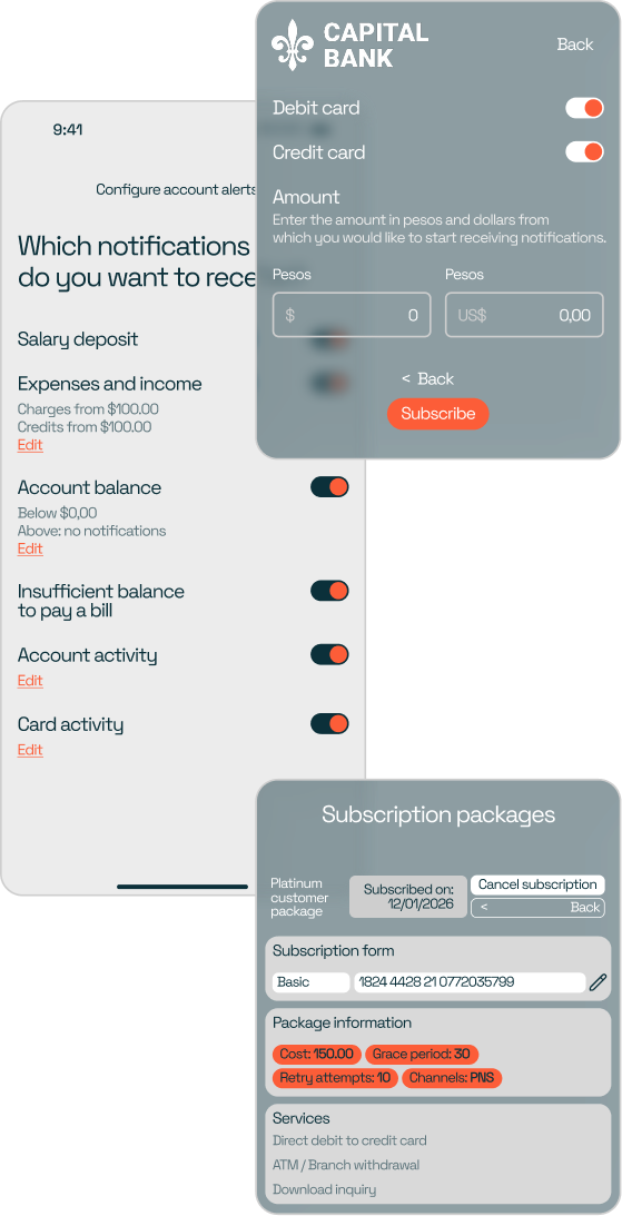 Relevance begins with respecting the banking customer’s preferences. The Subscription Engine allows each user to configure which alerts they want to receive — by channel, transaction type, or amount. This way, every customer receives only the notifications they have subscribed to, while the bank maintains control, security, and the delivery of critical alerts.